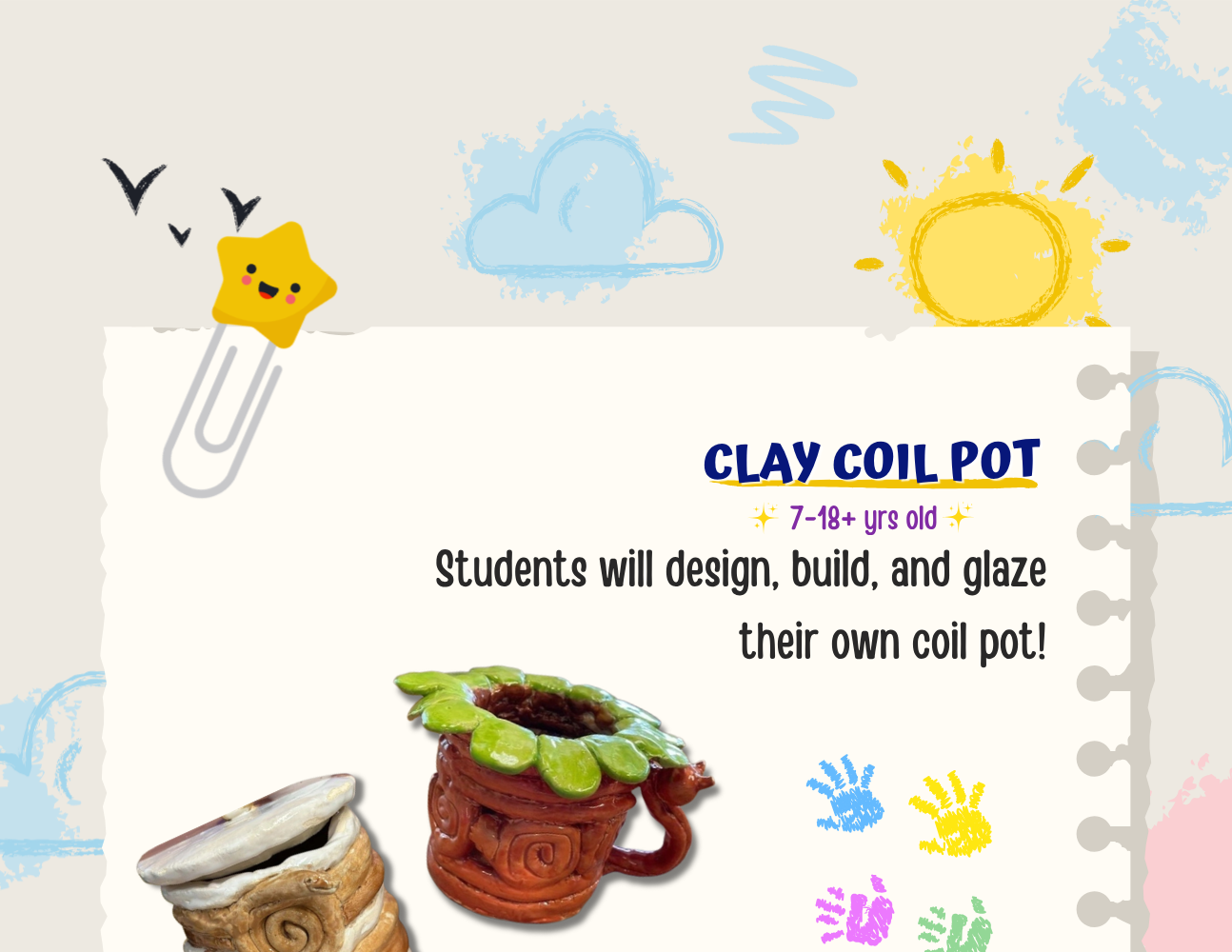 Choose from 16 unique summer art camps below! Each camp runs one week (Mon–Fri), with sessions available all summer long. Most classes are 1 hour 15 minutes per day, with a few extended 2.5-hour options.